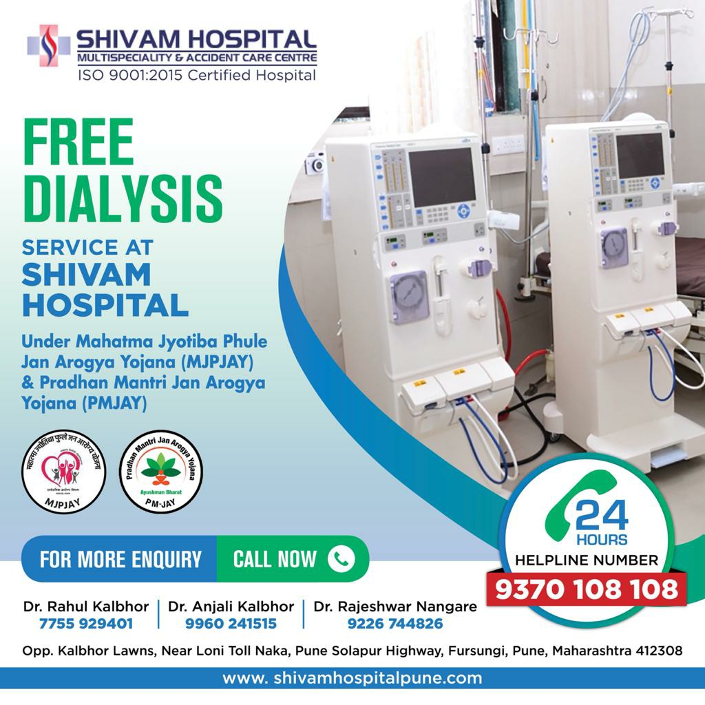 मोफत डायलिसिस सुविधा शिवम हॉस्पिटल येथे महात्मा ज्योतिबा फुले जन आरोग्य योजने अंतर्गत डायलिसिस सेवा मोफत देण्यात येते।